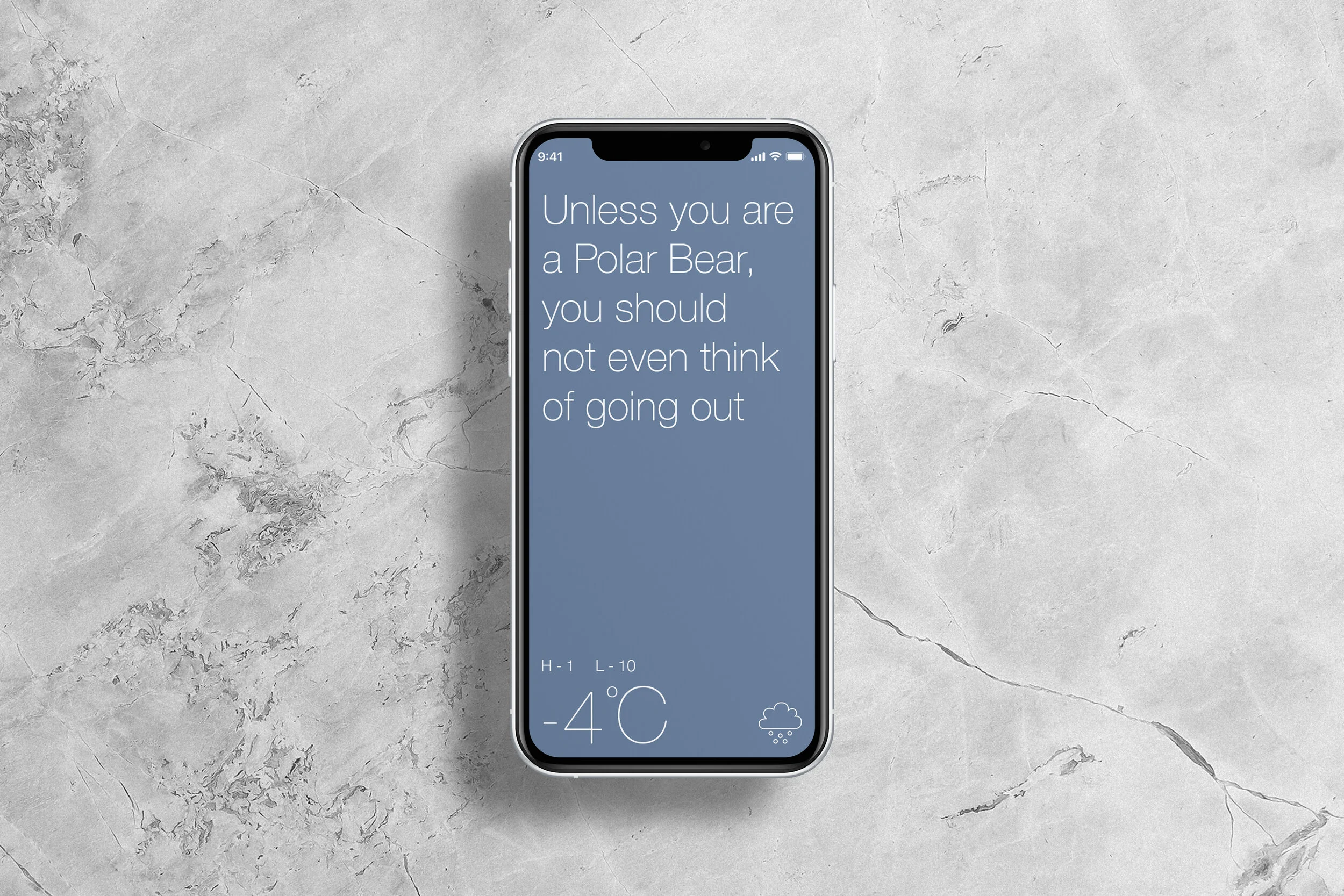This app was designed, developed and deployed on the smallest of smallest budgets and shortest of shortest deadlines. It was born out of the frustration that every app on the market at the time of development gravitated towards image or video loops which on a miserable cold morning left people feeling deflated. The light hearted humour is used to evoke positivity, tickles the brain, lifts the spirits and changes mood, hence the outlook of the day no matter what the WETHA conditions.